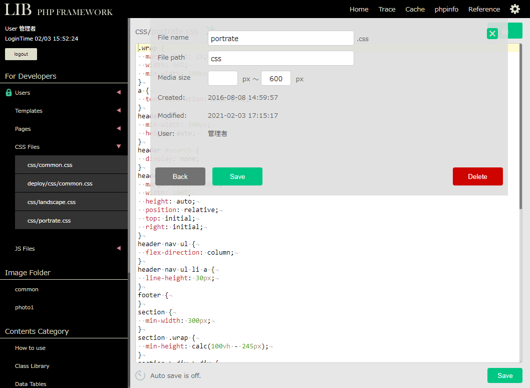 サイドメニューのCSS FilesをクリックするとWeb Studioで作成したCSSファイルが表示されます。