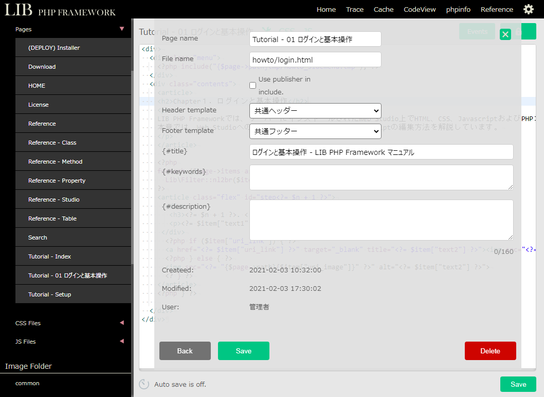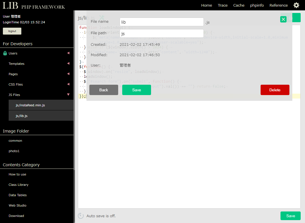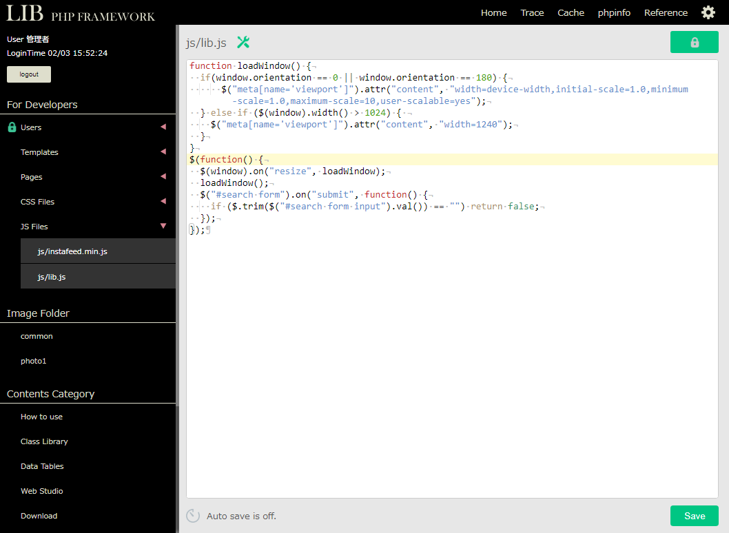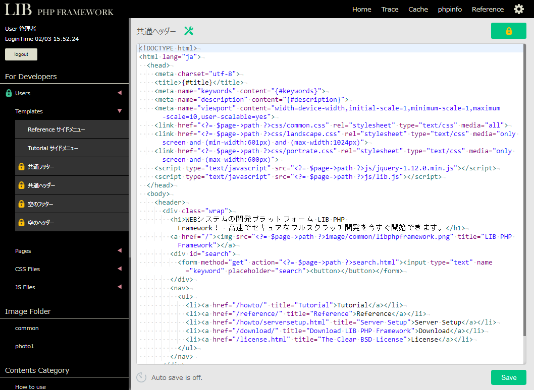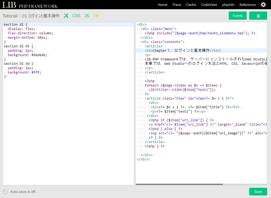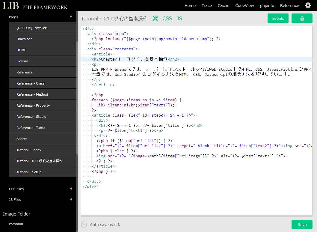 LIB PHP Frameworkでは、サーバーにインストールされたWeb Studio上でHTML、CSS、JavascriptおよびPHPコードを編集します。