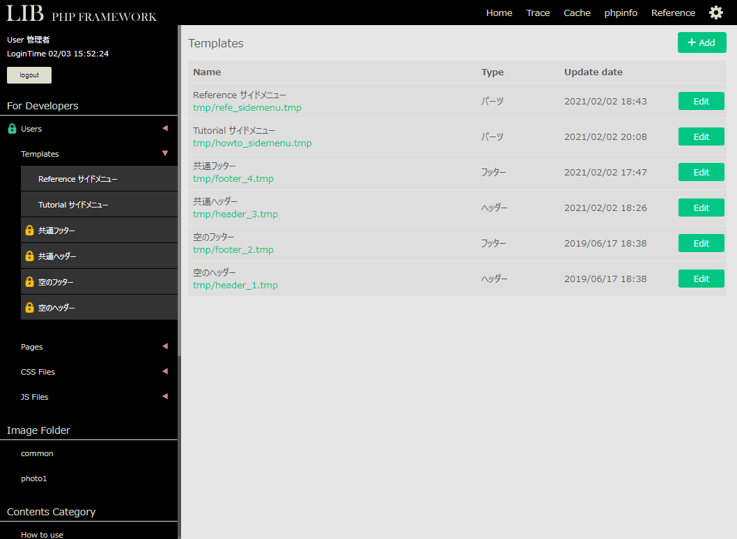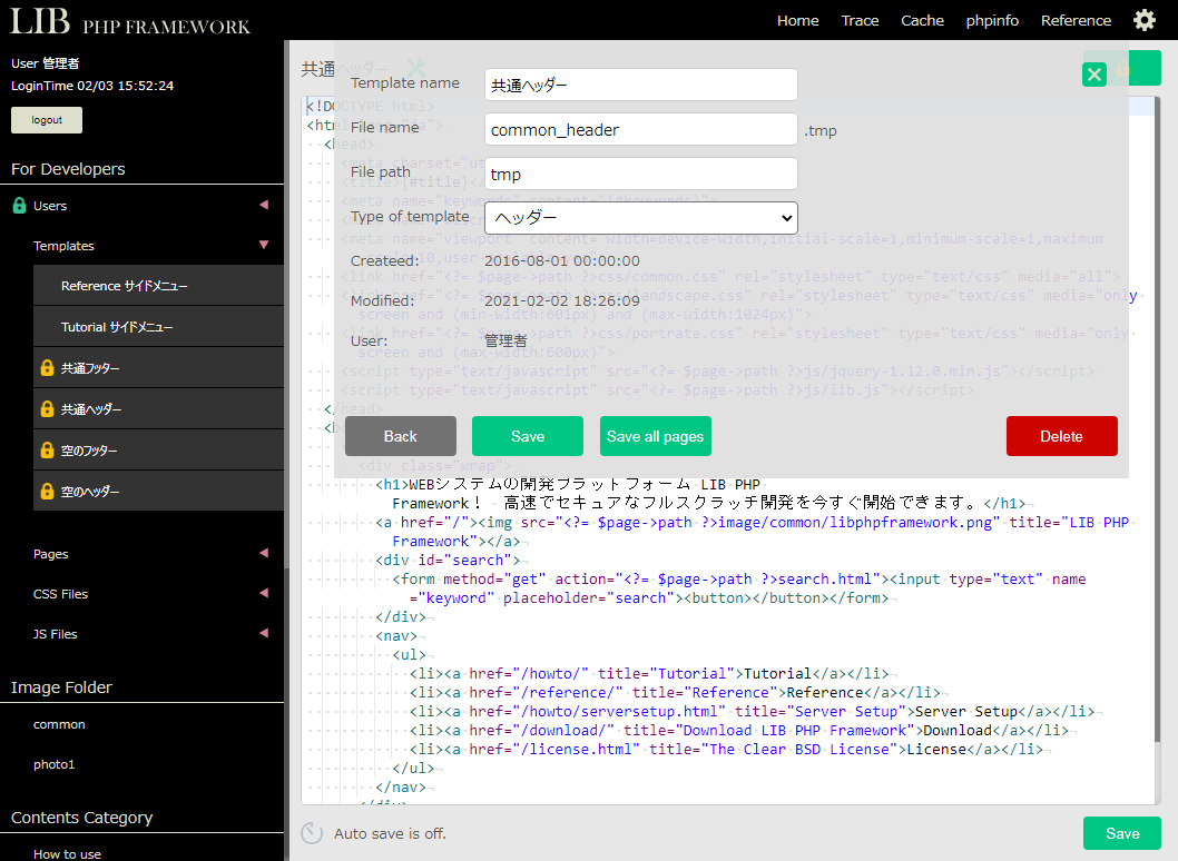 LIB PHP Frameworkでは、ヘッダーテンプレートとフッターテンプレートに挟まる形でページが生成されます。
