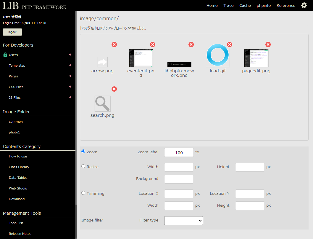 サイドメニューのImage Folderグループにあるcommonをクリックするとアップロード済みの画像ファイルが表示されます。