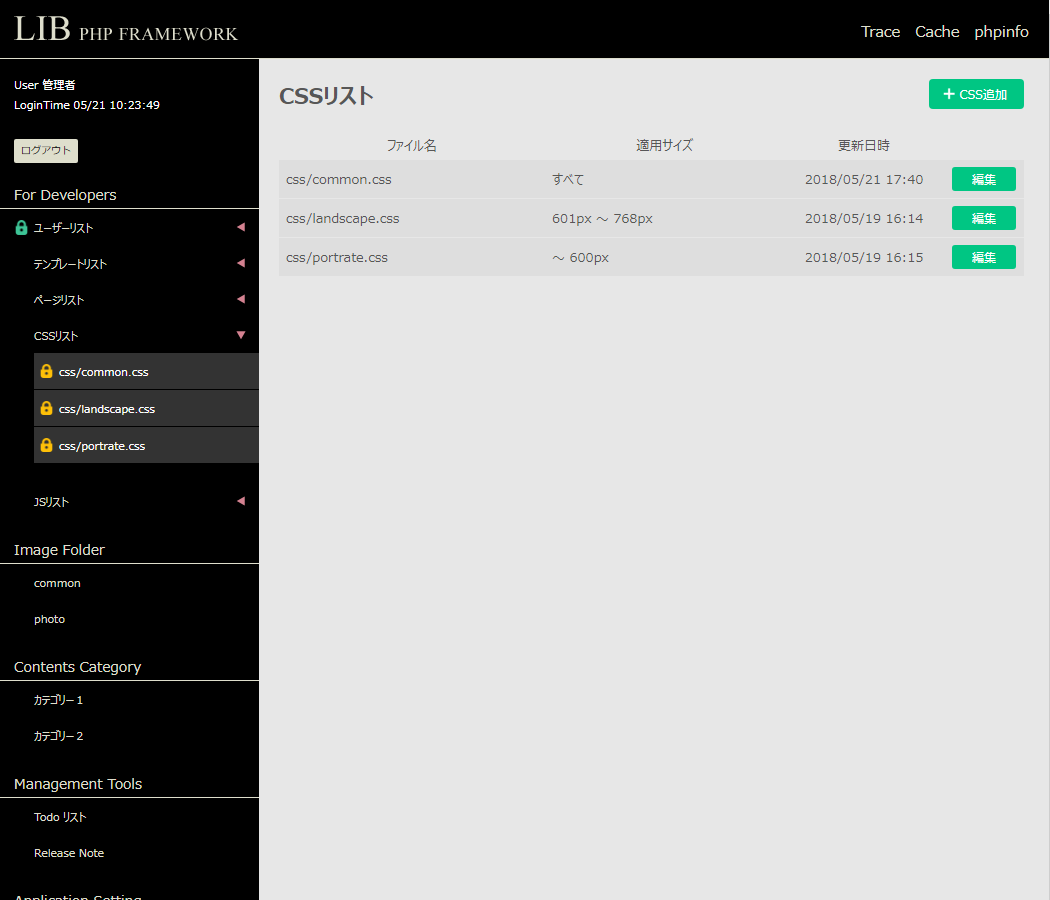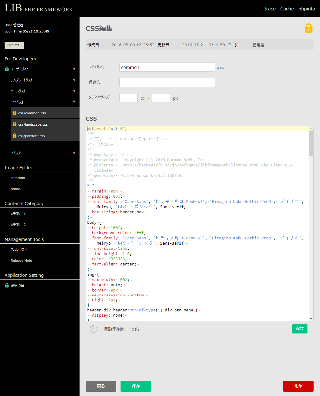 2.CSS編集 CSS編集では、CSSファイルのファイル名とコンテンツ部のデータを保存します。 ファイル名を入力します。 ファイルの対応サイズを入力します。 CSS を入力します。 保存をクリックします。 ※保存時に指定したファイル名でCSSファイル(ファイル名.css)が出力されます