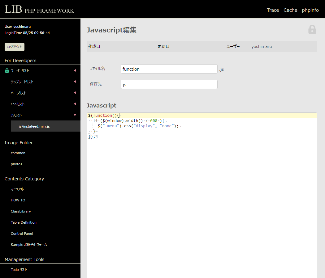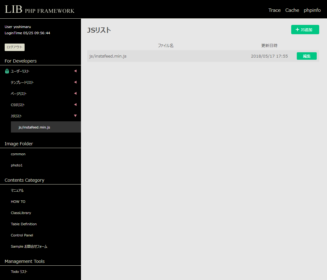 メニューの「For Developers JSリスト」を開き、jsの追加と編集を行います。